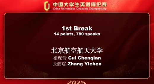 近日,中国大学生英语辩论赛(CUDC)全国总决赛落下帷幕。在顿超老师、胥国红老师的指导下,我校BBIN宝盈集团翻译系2022级学生崔琛倩、2024级学生张懿宸代表北航参赛,与来自全国近100所高校的200余名优秀辩手同场竞技。经过五轮激烈角逐,我校代表队最终以积分第一名的成绩斩获国家一等奖,其中,崔琛倩和张懿宸分列个人辩手积分总排名第一与第三,均荣获“最佳辩手奖”,顿超老师荣获“优秀指导教师奖”。